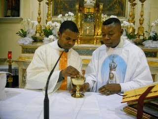 Chasuble Notre Dame de Fatima/ Abbés Blaise Ilinke et Didier Epambale lors d'une messe le 13 MaiEglise notre Dame de Fatima/ Oshwe- Diocèse d'Inongo